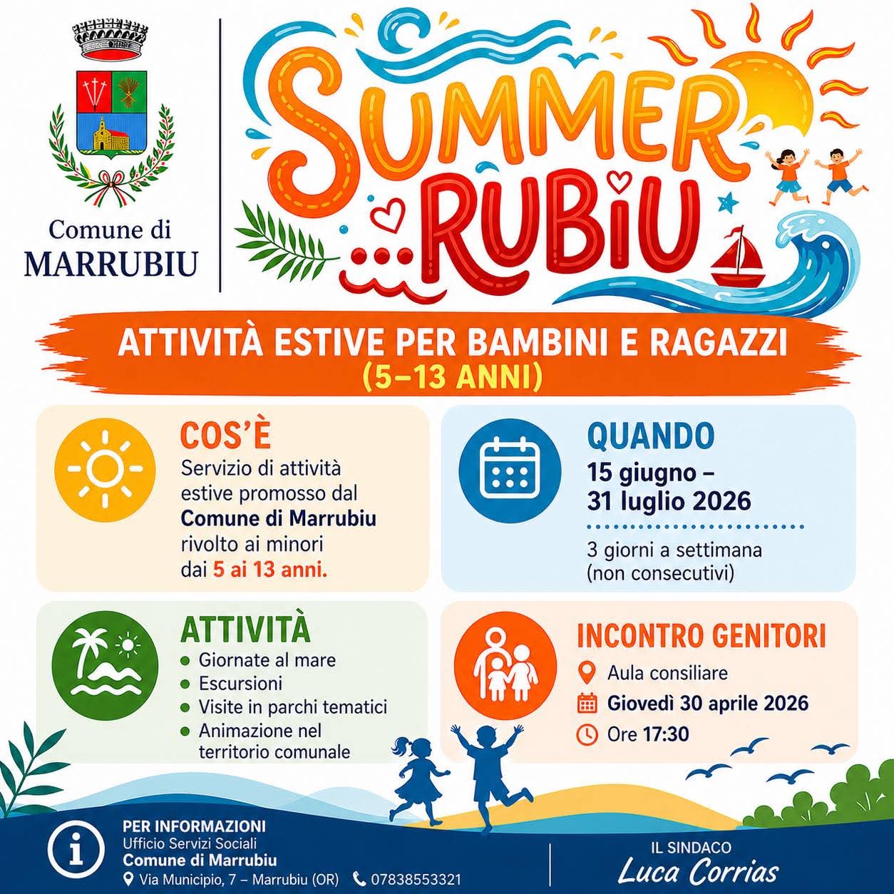 Il Comune di Marrubiu organizza Summer Rubiu: attività estive per bambini e ragazzi (5-13 anni) dal 15 giugno al 31 luglio 2026.